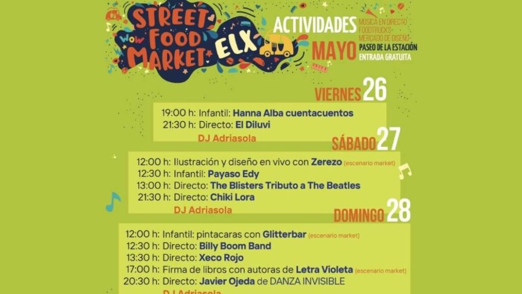 El concejal de Comercio del Ayuntamiento de Elche, Felip Sànchez, ha explicado que, después de que haya habido que posponer el “Elx Street Food Market” a los días 26, 27 y 28 de mayo debido a la previsión de fuertes lluvias, ha sido necesario hacer algunos ajustes en la programación debido a la disponibilidad de los artistas.