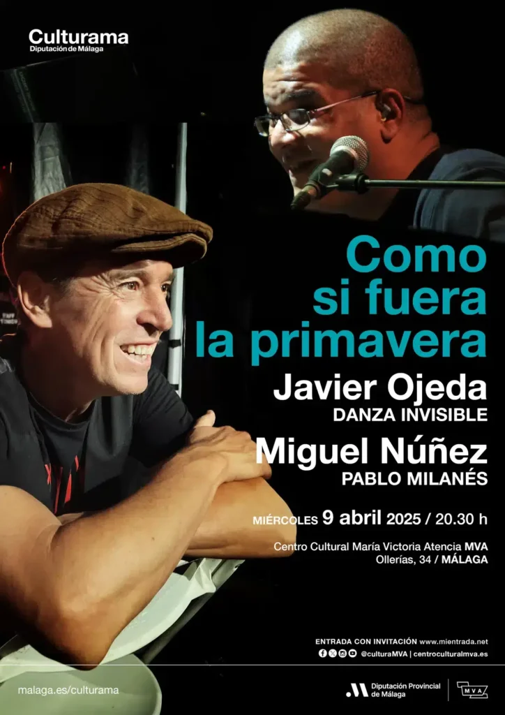 Javier Ojeda y Miguel Núñez ofrecerán tres conciertos creados en exclusiva para la Diputación de Málaga en los que rendirán homenaje a Pablo Milanés. Bajo el título ‘Como si fuera la primavera’, verso del tema ‘Canción’ de Milanés, actuarán el 9 de abril, a las 20.30 horas, en el MVA; el 11 en el Palacio de la Paz de Fuengirola, con entrada libre hasta completar aforo; y la última parada será el 4 de mayo el Teatro del Carmen de Vélez-Málaga. Será a las 19.00 horas con entrada libre hasta completar aforo. Para asistir al concierto del día 9 en el centro de Ollerías es necesario tener invitación. Se pueden descargar gratuitamente a partir del 7 de abril, a las 10:00 horas, en mientrada.net