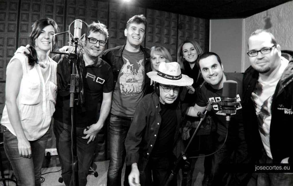 El vocalista y sus dos acompañantes a los coros, Nando Hidalgo y Yohany Suárez, se situaron en disposición triangular mientras eran rodeados en la cabina por un grupito de amigos en el que halagado pude incluirme. Mientras íbamos escuchando la música íbamos siguiendo las indicaciones de Javier acerca de cuando debíamos bajar el tono o elevarlo según los movimientos de sus manos, a modo de «director de fuerga (sic)», con el fin de proporcionar auténtico ambiente de taberna a la grabación. Por cierto, soberbia: los entrelazados de piano y tres entre Pancho Amat y su hijo Daniel son para chuparse los dedos, por no hablar del resto de instrumentos, ¡vaya cha-cha-cha!