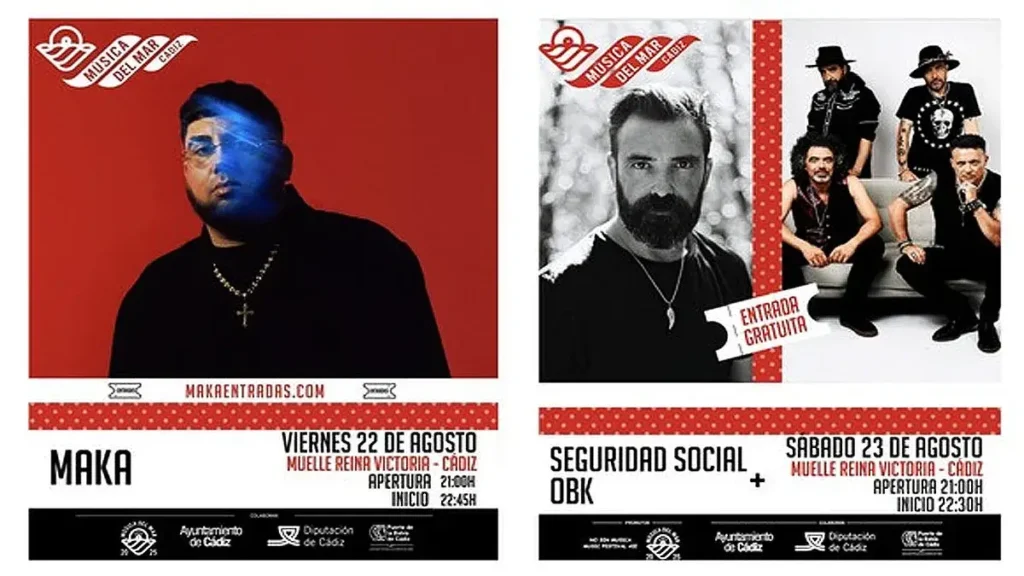 El ciclo de conciertos que ha llenado de música el verano gaditano llega a su fin este fin de semana en el Muelle Reina Victoria, con un cartel de lujo que despide la edición: Maka, OBK y Seguridad Social