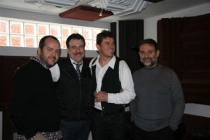 El alcalde de Lorca, Francisco Jódar, junto al cantante y componente del grupo Danza Invisible, Javier Ojeda; el presidente de Cruz Roja Lorca, Juan Carlos
