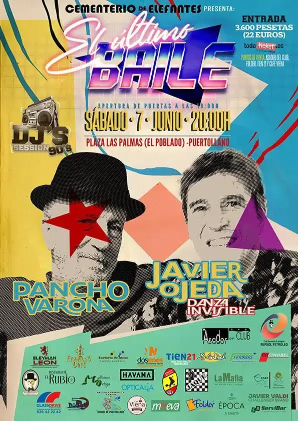 La Plaza Las Palmas de El Poblado de Puertollano albergará el sábado 7 de junio, a las 20 horas, el concierto El Último Baile con Pancho Varona, coautor de los temas más emblemáticos de Joaquín Sabina, y Javier Ojeda, cantante de Danza Invisible. Además, habrá sesión de dj’s con temas de los noventa.