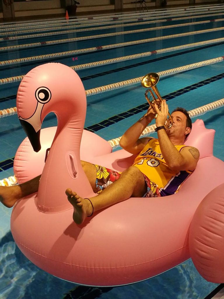 Foto 1: Aurelius Varga en su flotador-flamenco.