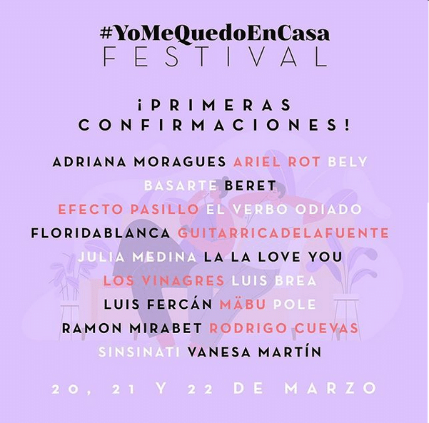 El ‘Festival #YoMeQuedoEnCasa’, pionero de esta iniciativa, podrá disfrutarse desde el viernes 20 hasta el domingo 22. Aún no han publicado horario, toca estar pendiente de su cuenta de Instagram.